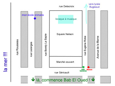 Le square Nelson abritait tous les matins dans sa partie couverte un marché fait d'étals de marchands de poissons, de fruits et légumes... Ali le marchand de poissons était très connu pour ses excellents poissons -ah les petits rougets d'Ali !!!- et également pour sa forte carrure et son franc parler. Il était à coup sûr, disait-on membre du FLN. Un jour, il a disparu. Mon père m'a raconté qu'il était allé le voir avec quelques amis pour le mettre en garde contre des rumeurs qui circulaient et qui disaient qu'il serait la prochaine cible de l'OAS. Il a laissé son étal plein de poissons. On ne l'a jamais revu. Il avait dû se réfugier dans la Casbah.